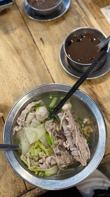 奶白色的汤底是整碗的灵魂,清透却醇厚,喝一口就暖到胃里。宽扁的河粉浸在汤中,软滑筋道,吸饱了鲜美的汤汁。大块的肋排炖得酥烂,轻轻一抿就脱骨,肉香混着汤香在嘴里散开;手工肉丸Q弹紧实,咬开还能尝到肉的肌理;薄切的肉片嫩而不柴,在热汤里涮过就刚好入味。翠绿的青菜、豆芽、葱花点缀其间,既解了肉的腻,又添了几分清爽,还有炸得金黄的油渣,添了一口酥脆的层次。