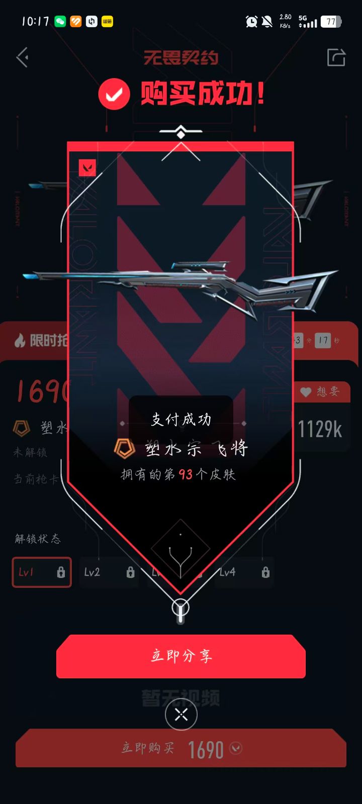 终于拿下这把塑水宗·飞将!看着屏幕弹出“购买成功”的红色勋章,瞬间觉得之前的等待都值了,这可是我收集的第93个皮肤,仪式感直接拉满。
