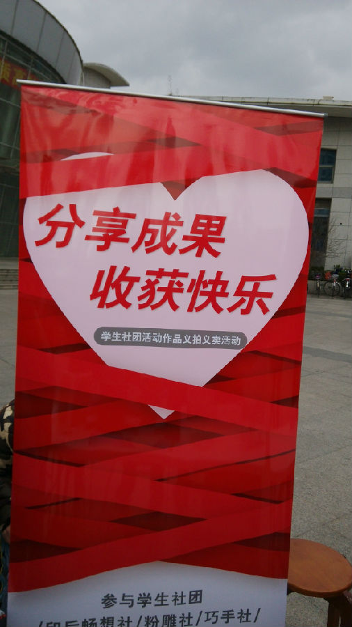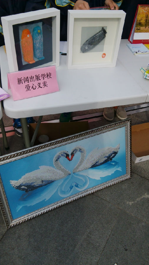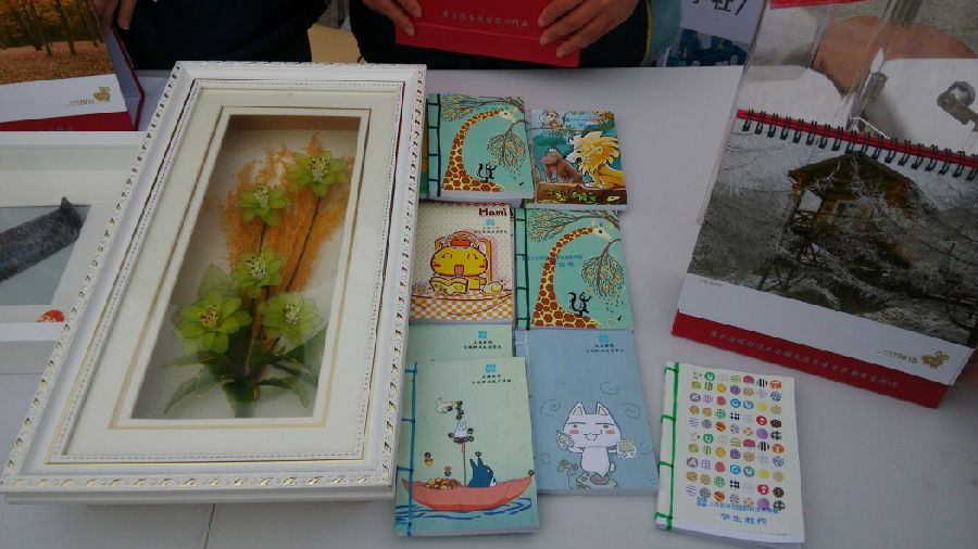 有印后畅想社学生制作的古线装本子,有老师拍摄学生装订的2015年台历,有粉雕社雕刻的年年有“鱼”,有巧手社纯手工制作的代表着永恒、纯洁的天鹅……每一件物品都有着不同的纪念意义,每一件物品的卖出都是一份爱心的奉献,每一件物品的成功交易都是一份快乐的传递。